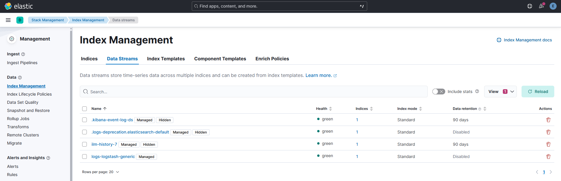 - 切换至 Data Streams,可以看到 logs-logstash-generic