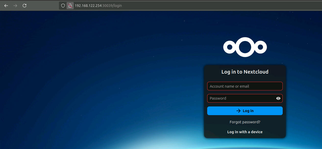 等待 nextcloud 初始化完成后登录即可,具体时间基于系统配置,一般是 20~30分钟,例如我的URL是:https://192.168.122.254:30039