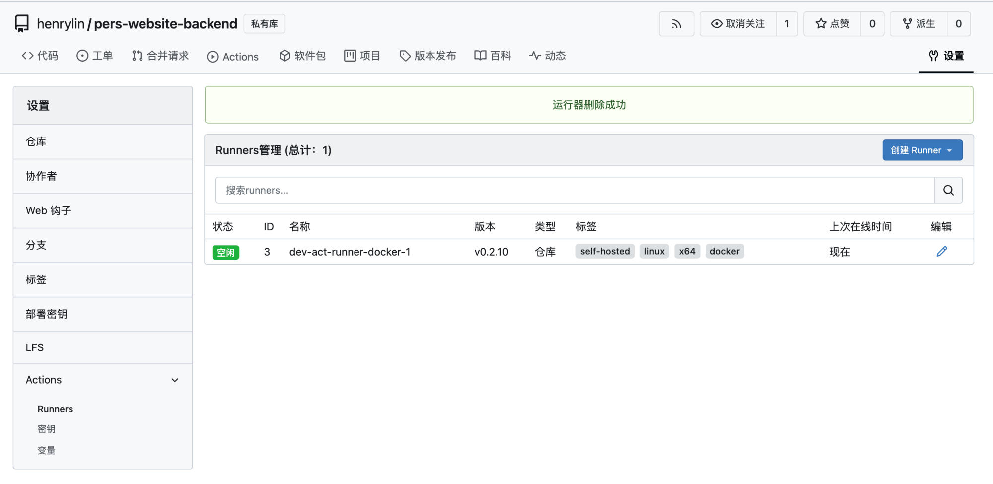 time="2025-10-26T08:30:54Z" level=info msg="runner: dev-act-runner-docker-1, with version: v0.2.10, with labels: [self-hosted linux x64 docker], declare successfully"