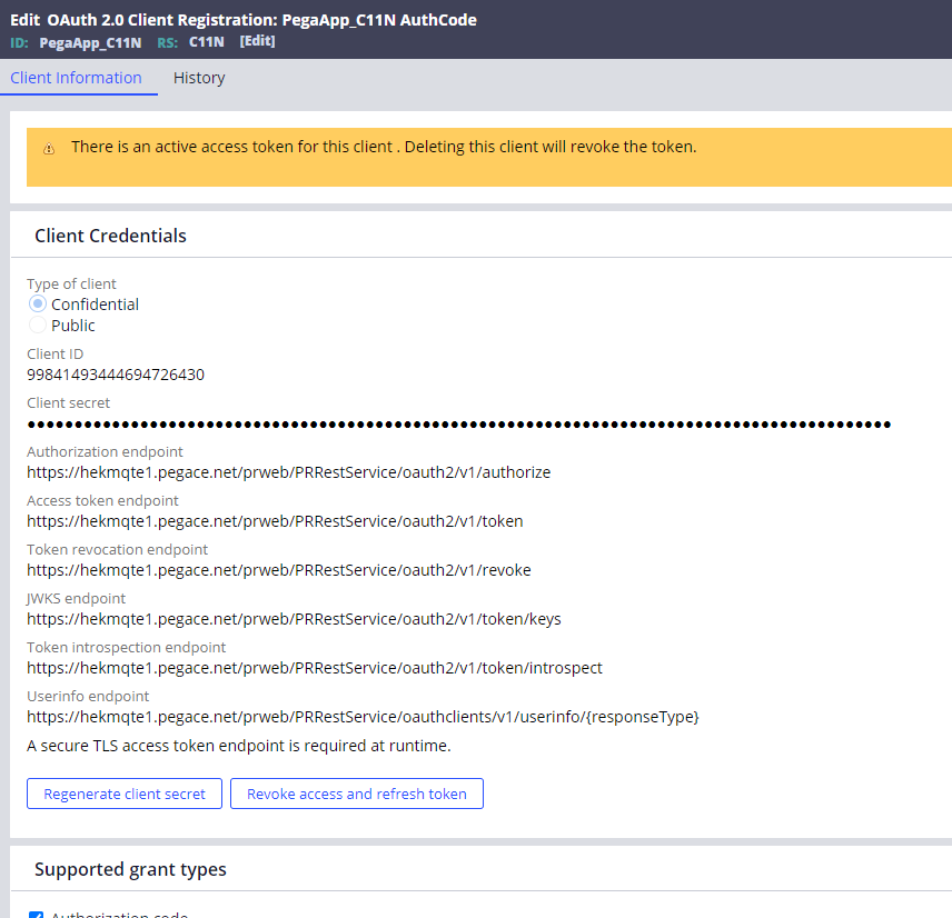 - 在 OAuth 2.0 Client Registration > PegaApp_C11N 中生成 Client Secret。
