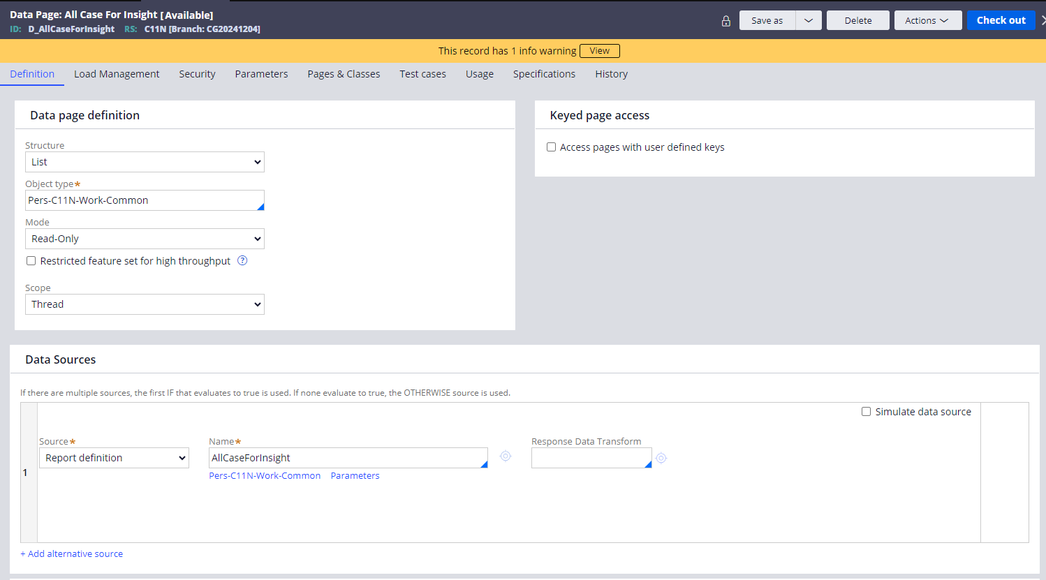 创建一个 Query Data Page, 简单创建一个 D_AllCaseForInsight Data Page,创建时配置如下: