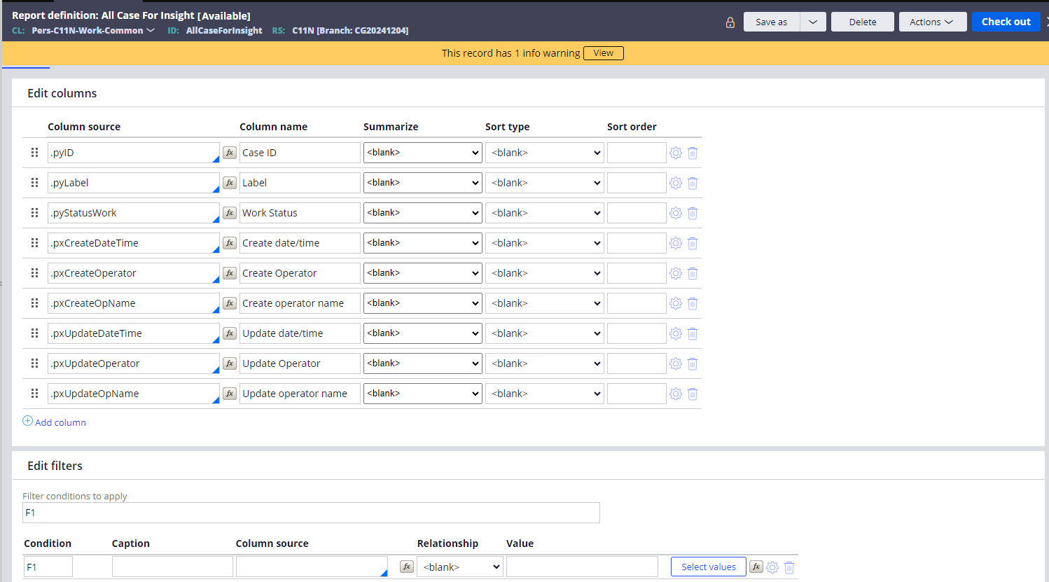 - 创建一个 Report Definition 用于获取相关数据,简单创建一个 All Case For Insight Report.