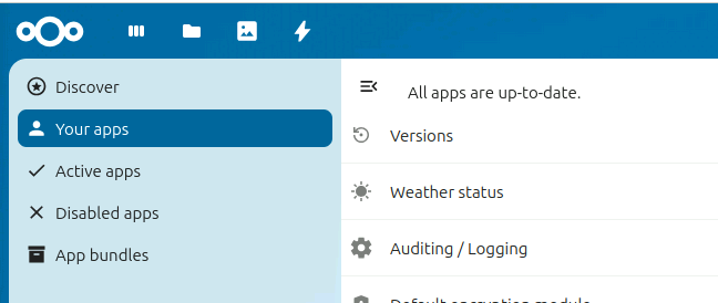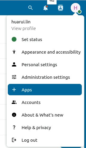 登录 nextcloud 主页,点击右上角账号图标,在菜单栏中选择 Apps