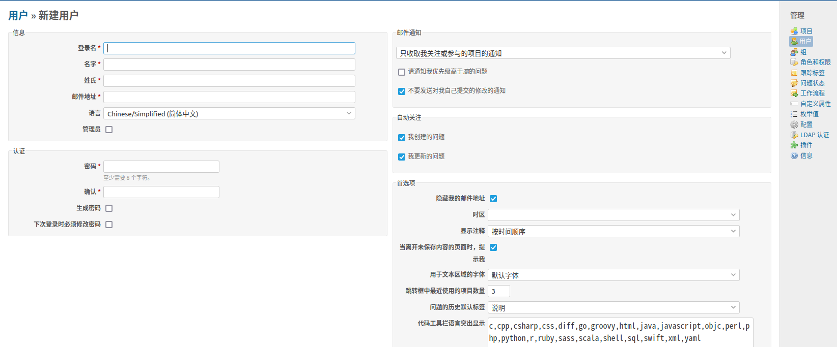 背景简介 在Redmine中创建账号,促使多个用户协同完成工作。 环境配置 Redmine 5.1.3 详细步骤 采用管理员账号登录系统后,点击管理 → 用户 菜单。 点击新建用户 按钮,填写用户信息后提交即可。 用户创建成功后返回首页登录即可。