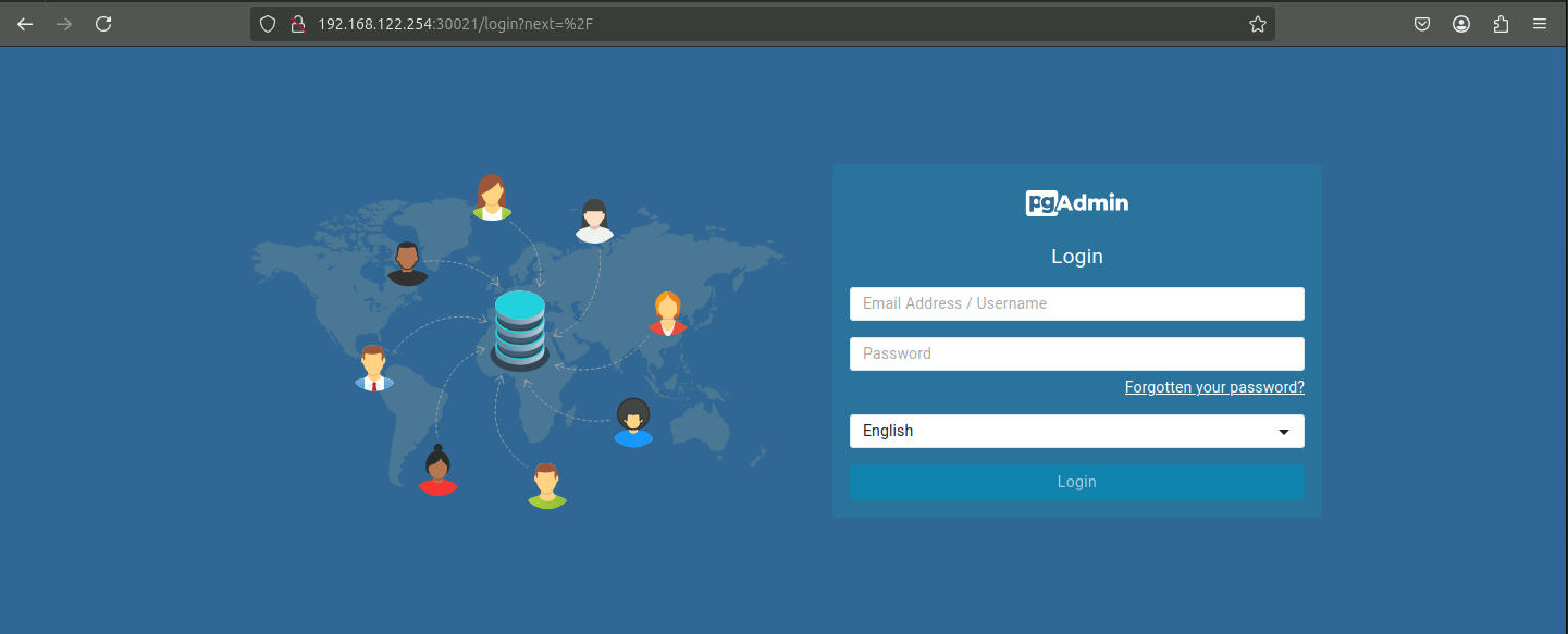 ff55c6a0a8e9 private-docker-repo:20706/dpage/pgadmin4:v1.0.0 "/entrypoint.sh" About a minute ago Up About a minute 443/tcp, 0.0.0.0:30021->80/tcp, [::]:30021->80/tcp pgadmin4-pgadmin4-1