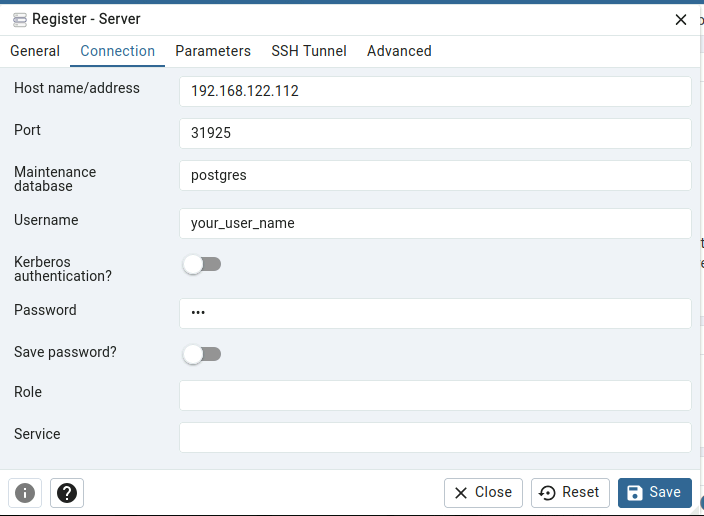 Connection: Host name/address, Port, Maintenance database, Username, Password